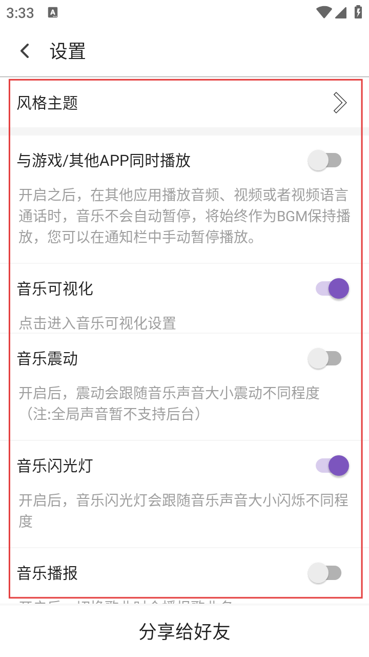 4、开启后,还可在设置页面查看【风格主题】【音乐可视化】等其他功能选项,根据需求进行设置。
