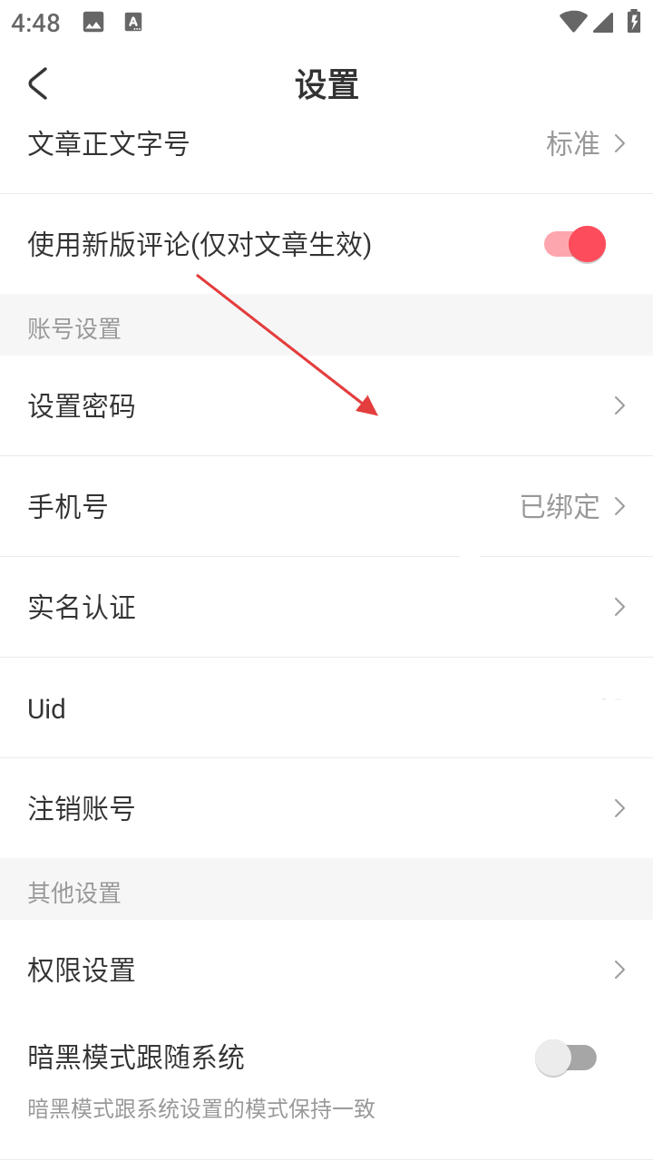 3、在设置界面,若要设置账号密码,点击【设置密码】选项,进入手机验证页面。