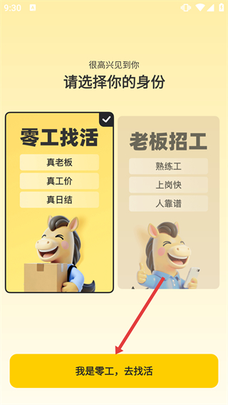 1、身份选择页选定【零工找活】,点击【我是零工-去找活】,进入主打【真老板-真工价-真日结】的零工界面。