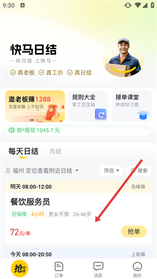 2、快马日结主界面找到【餐饮服务员】岗位,点击岗位右侧【抢单】按钮,进入该岗位详情页面。