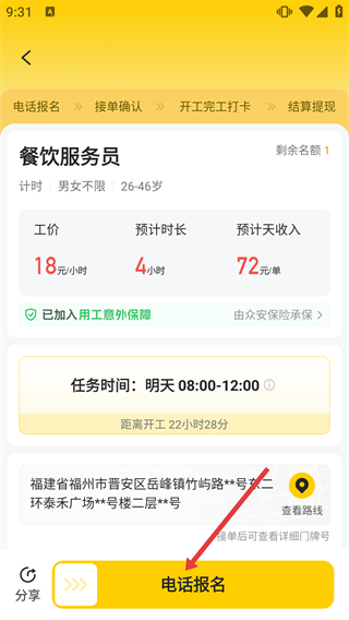 3、主动沟通确认细节点击职位详情页可直接拨打雇主电话,咨询工作内容、工时等具体问题,双方协商一致后即可约定上岗时间与地点。