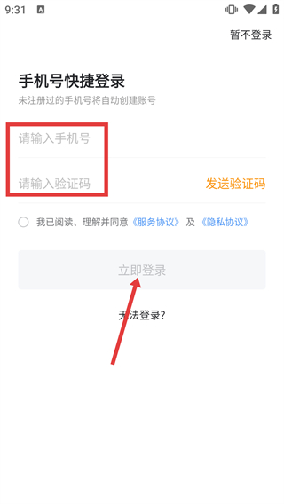 4、手机号快捷登录页填手机号、验证码,勾选【服务协议】【隐私协议】,点【立即登录】完成验证。