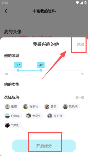 2、在 “丰富我的资料” 环节,若不想设置 “我感兴趣的他” 的条件,可点击 “跳过”。