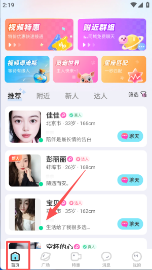 1、进入软件首页,可看到视频特惠、附近群组等板块,还有推荐的用户列表,能点击聊天互动。