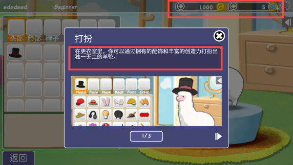 3、利用拥有的配饰,发挥创造力,在更衣室通过【头部】【脸部】【脖子】等部位的装扮,打造独特羊驼。