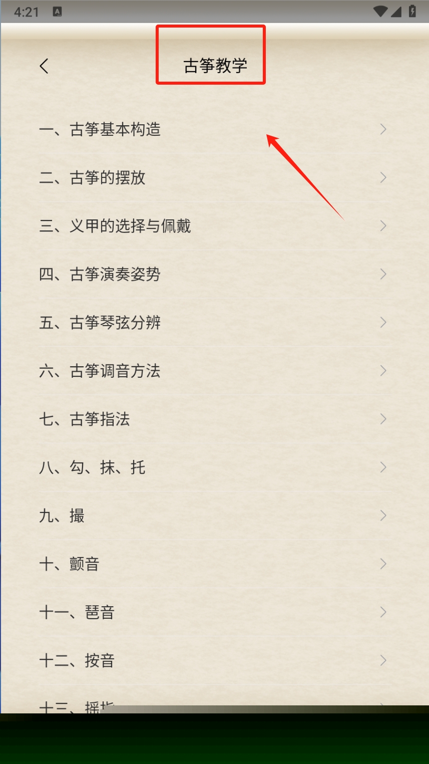 2、学习古筝教学,点击“古筝教学”进入教学页面,开始学习古筝的基本构造和演奏技巧。