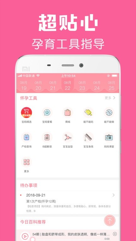 3、个性化知识推送:依据怀孕周期提供针对性的营养建议、运动指导和孕期禁忌,内容均来自权威医学机构。