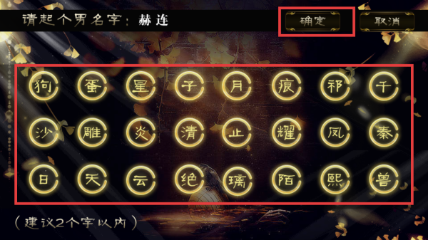 2、点击选择文字为主角起名,完成后点击【确定】。