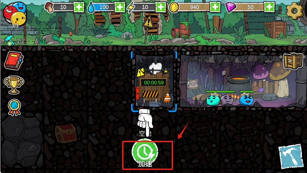 3、探索与收集:派遣史莱姆小队搜索废弃实验室、超市等场景,获取种子、电池等关键物资,解锁科技树。