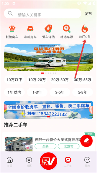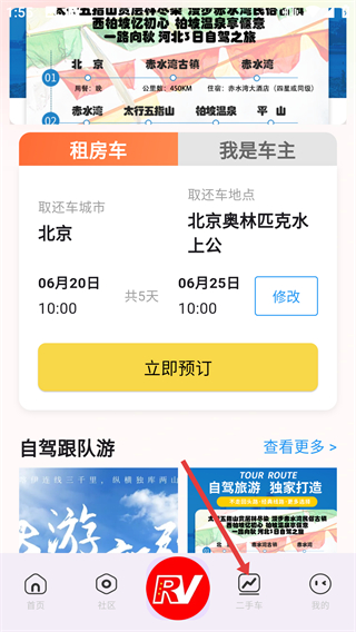 1、在房车服务页面,点击底部【二手车】进入对应板块。