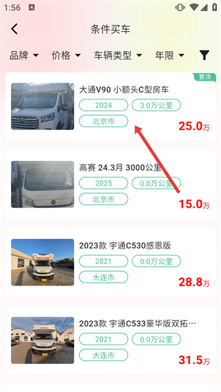 3、在条件买车页面,可通过品牌、价格等维度筛选,选择目标房车条目查看详情。