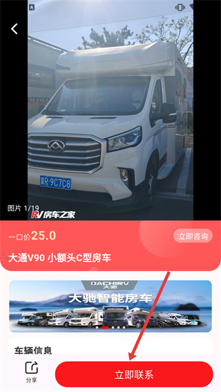 4、进入房车详情页,查看车辆信息后,点击【立即联系】完成咨询沟通。