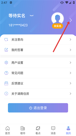 2、在“我的”页面中,点击显示“未实名”的个人信息区域,进入到个人中心页面。