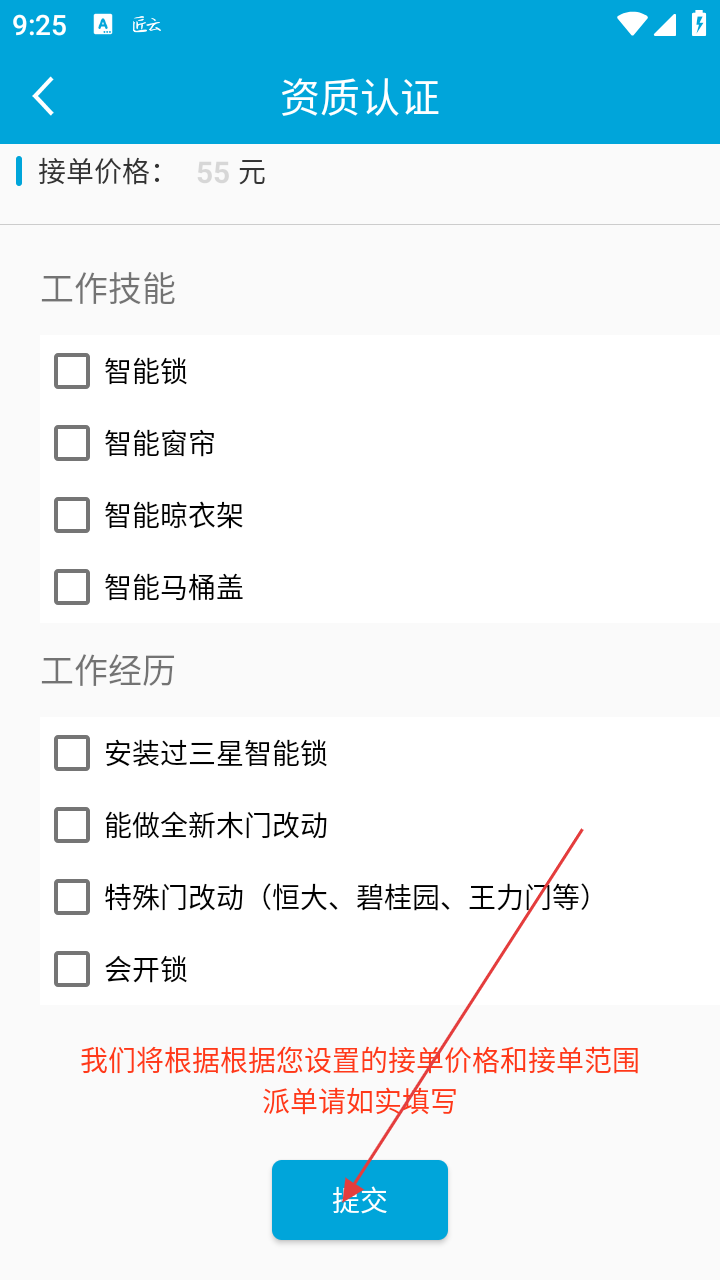 4、资质认证后续页,选工作技能、工作经历,确认后点击底部【提交】完成认证。