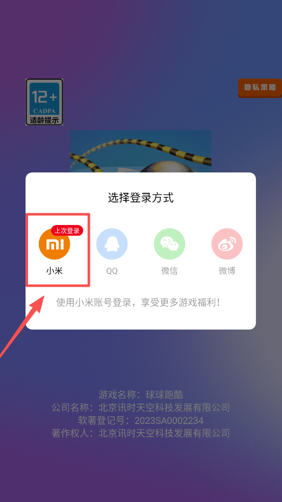 1、点击“上次登录”按钮,快速使用小米账号登录游戏,享受游戏福利。
