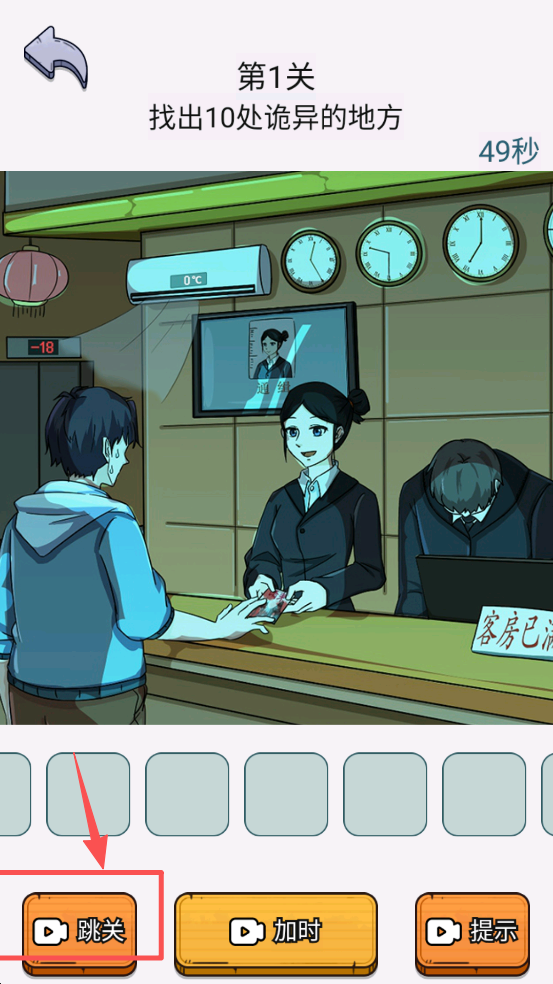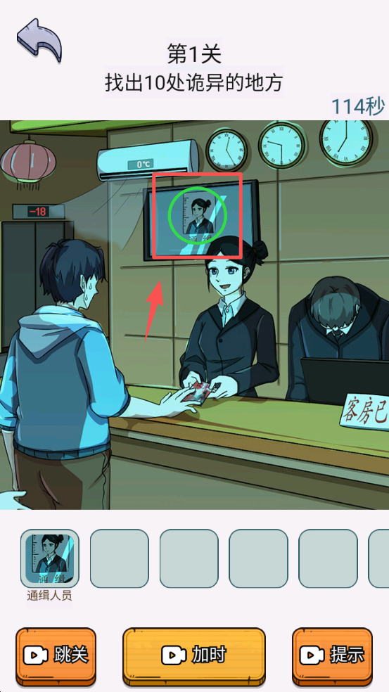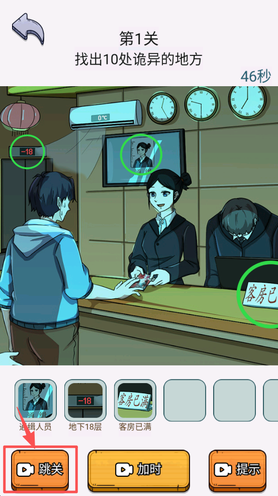 4、找出所有异常后,点击“跳关”按钮进入下一关,继续游戏。