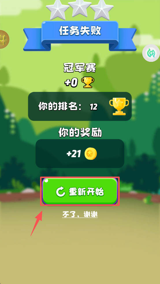 4、任务失败后,点击“重新开始”按钮,再次尝试挑战关卡。