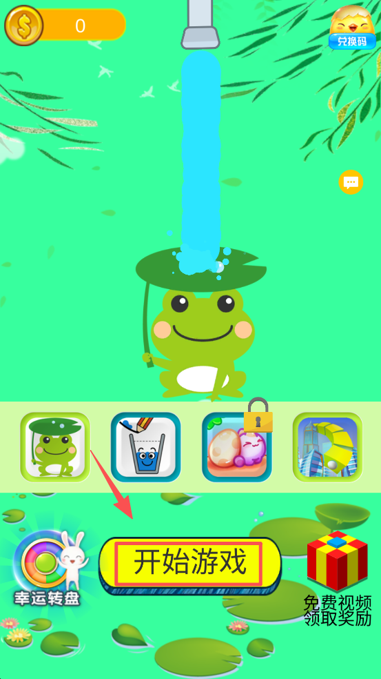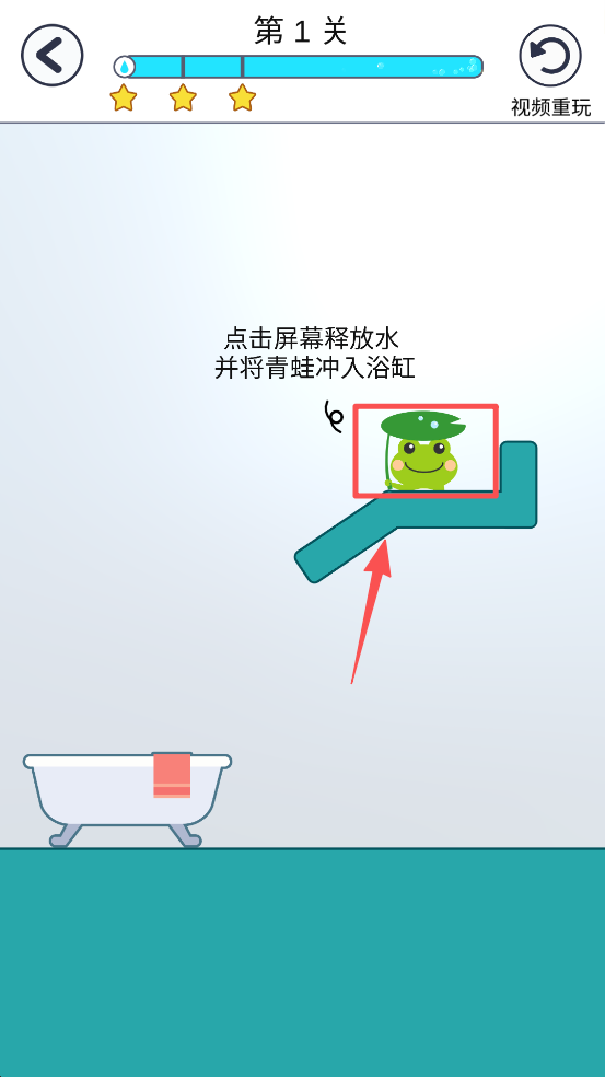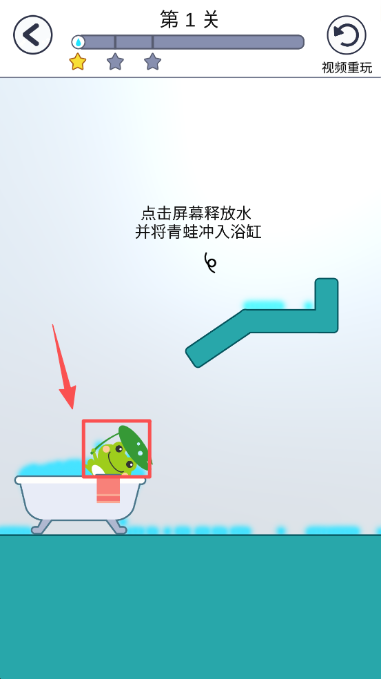 2、在第一关,点击屏幕释放水,把青蛙冲入浴缸。