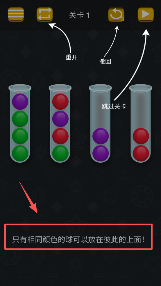 4、了解游戏规则,只有相同颜色的球可以放在彼此的上面,开始你的智慧挑战。