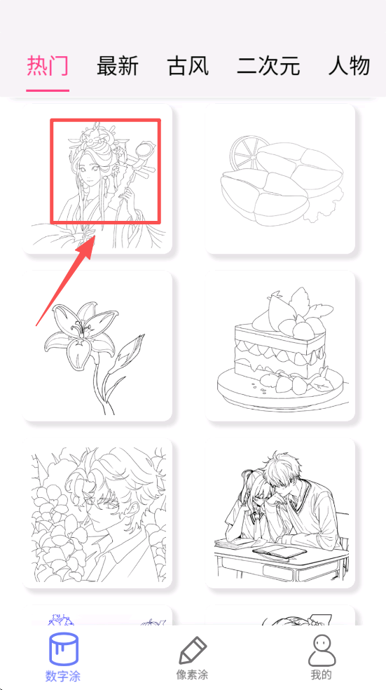 1、选择您想要上色的图片,例如“热门”分类中的古风人物。