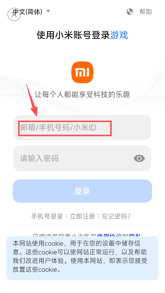 2、在登录界面,输入你的邮箱、手机号或小米ID和密码进行登录。