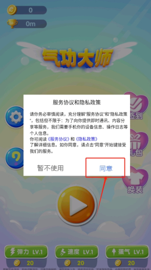 2、阅读并同意服务协议和隐私政策,点击“同意”继续游戏。