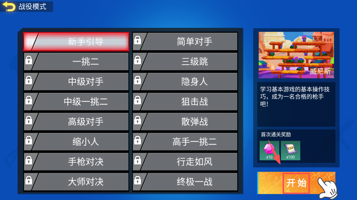 4、完成引导,跟随新手引导的指示,完成操作后点击“开始”进入游戏。