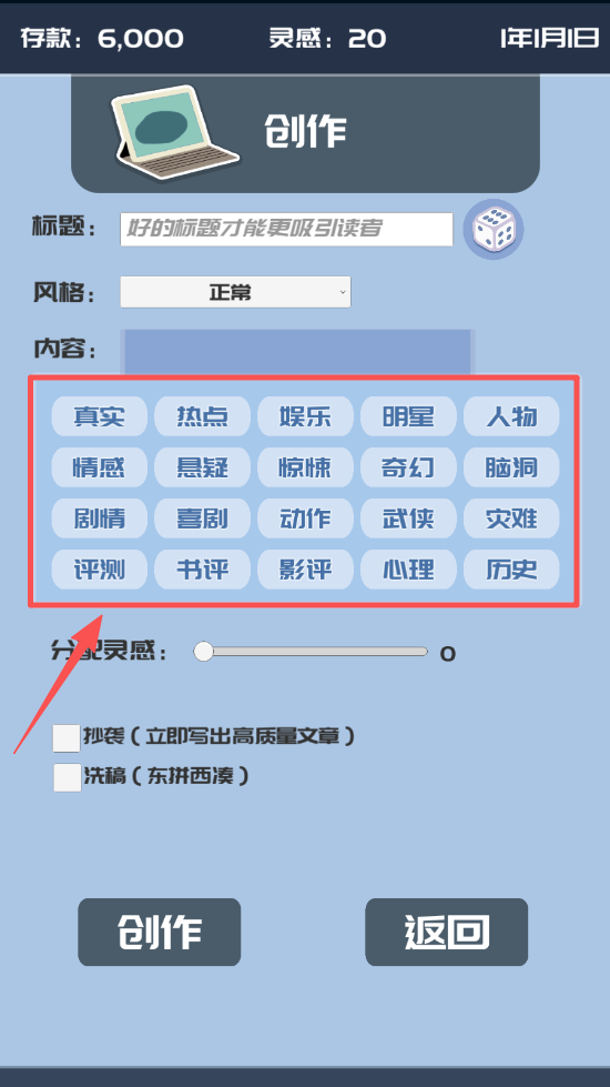 4、在创作界面,输入标题和内容,选择风格和灵感,点击“创作”完成文章发布。