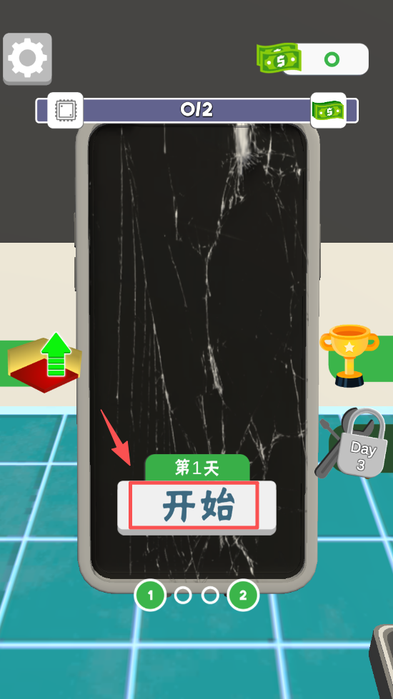 1、点击“开始”按钮,进入游戏第一天的修理任务,准备开始修理手机。