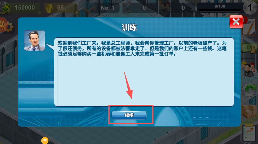 1、点击“继续”按钮,开始游戏教程,了解工厂背景和初始任务。
