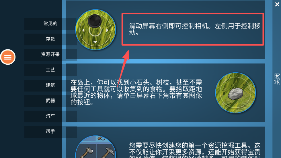3、滑动屏幕右侧控制相机,观察周围环境,寻找资源和潜在的危险。