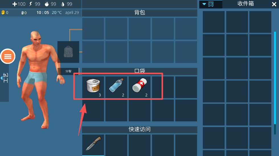 4、打开背包,检查收集到的物品,管理资源,为接下来的生存挑战做好准备。