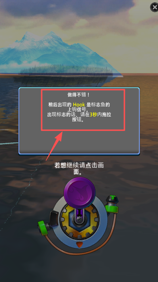 2、看到绿色箭头后,点击以确认成功钓到鱼,享受钓鱼的乐趣。