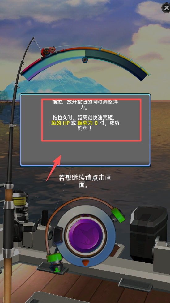 3、拖拉和放按钮同时调整弹力度,直到鱼的HP或距离为0,成功钓上鱼。