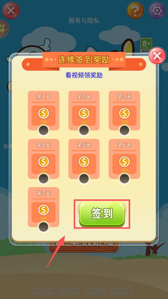 1、点击“签到”领取每日奖励。在游戏界面中,点击“签到”按钮以获取连续签到的奖励。