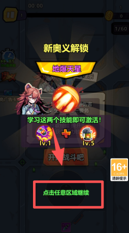 3、学习新技能后,点击“点击任意区域继续”按钮,返回游戏。