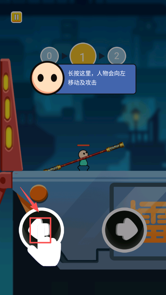 1、长按左侧虚拟摇杆,角色会向左移动并攻击,熟悉角色的基本移动方式。
