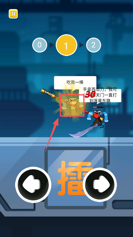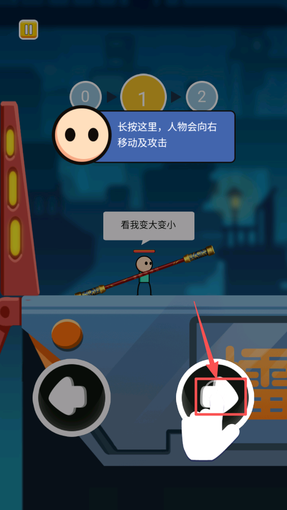 2、长按右侧虚拟摇杆,角色会向右移动并攻击,这是战斗中躲避和反击的关键。