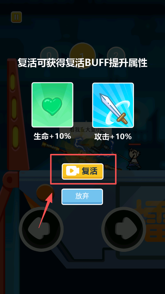 4、在角色死亡后,选择复活按钮,可以获得生命和攻击的临时提升,继续战斗。