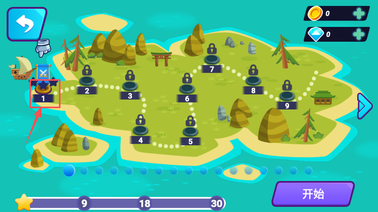 2、在关卡选择界面,点击数字1选择关卡,然后点击“开始”按钮进入战斗。