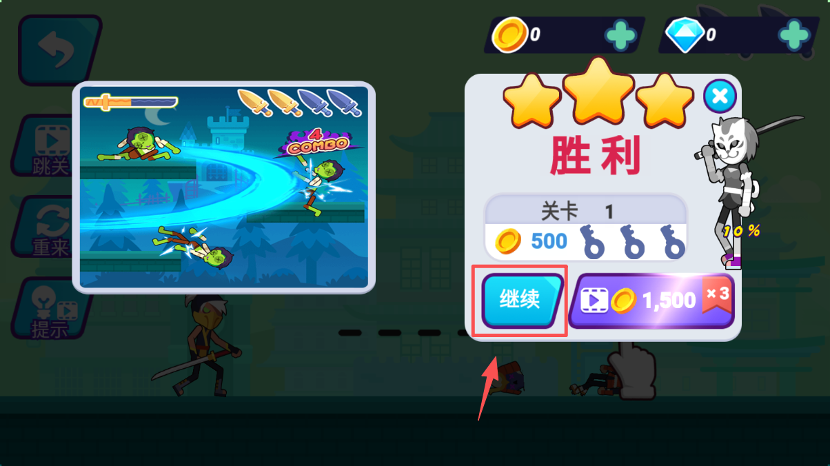 4、战斗胜利后,点击“继续”按钮领取奖励并进入下一关。