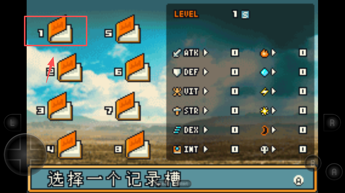 3、选择一个记录槽来保存你的游戏进度,点击“1”进行选择。