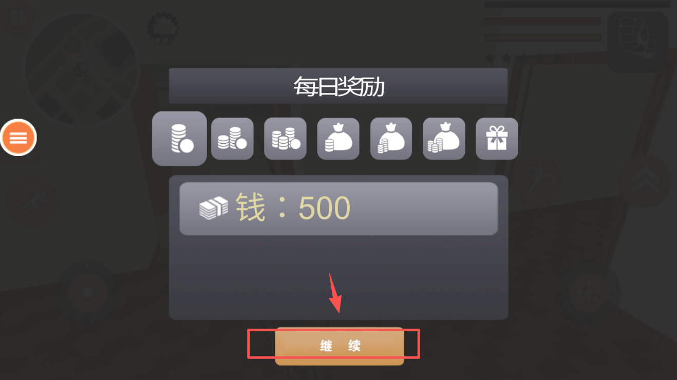 2、领取每日奖励。在每日奖励界面,点击“继续”领取金钱奖励。