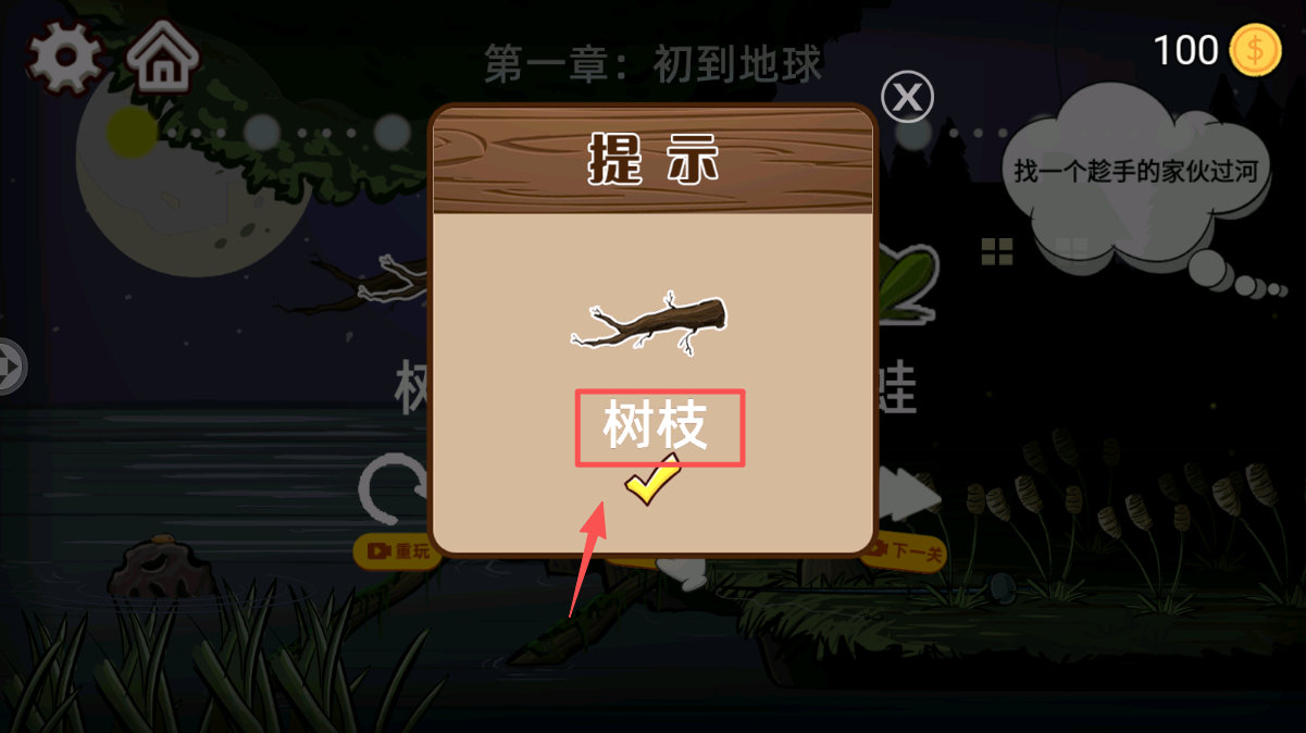 3、然后,根据提示选择“树枝”作为过河工具,点击以确认选择。