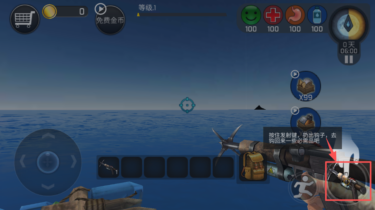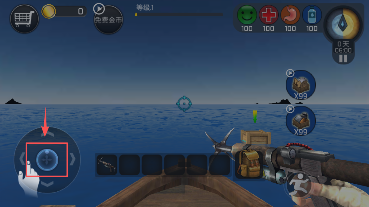 2、接着,使用左下角的虚拟摇杆控制木筏方向,保持在海上漂流。