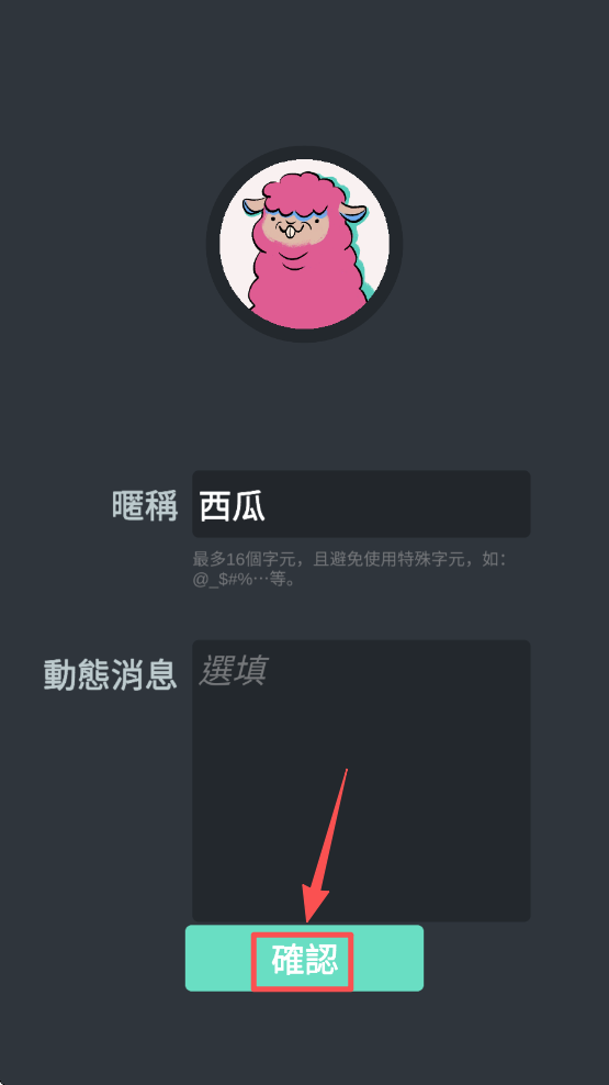 2、在昵称设置界面输入昵称,点击“確認”完成设置,进入下一步。