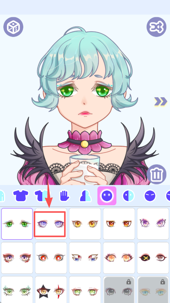 4、选择眼睛图标,从多种眼睛样式中挑选,让你的角色眼神更加生动。