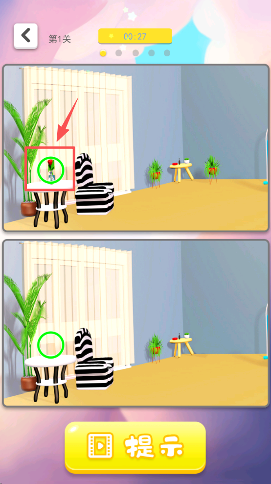 4、观察两幅图的差异,点击“提示”按钮获取帮助,找出不同之处。