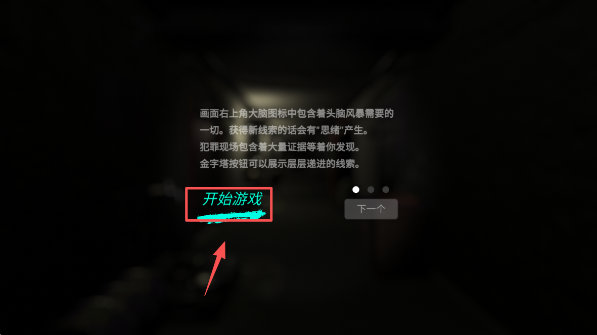 1、在游戏标题界面,点击“开始游戏”按钮,进入游戏,开启你的侦探之旅。