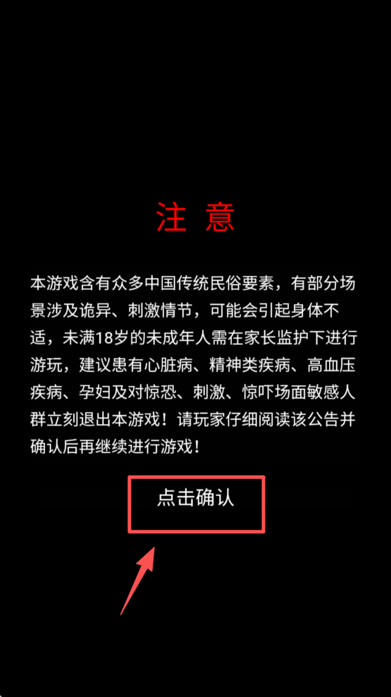 1、在游戏警告界面,点击“点击确认”按钮,同意条款并继续游戏,确保您了解游戏内容。